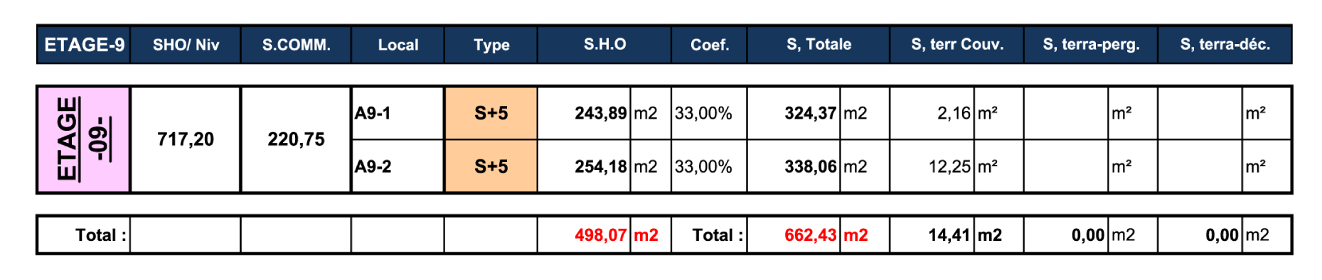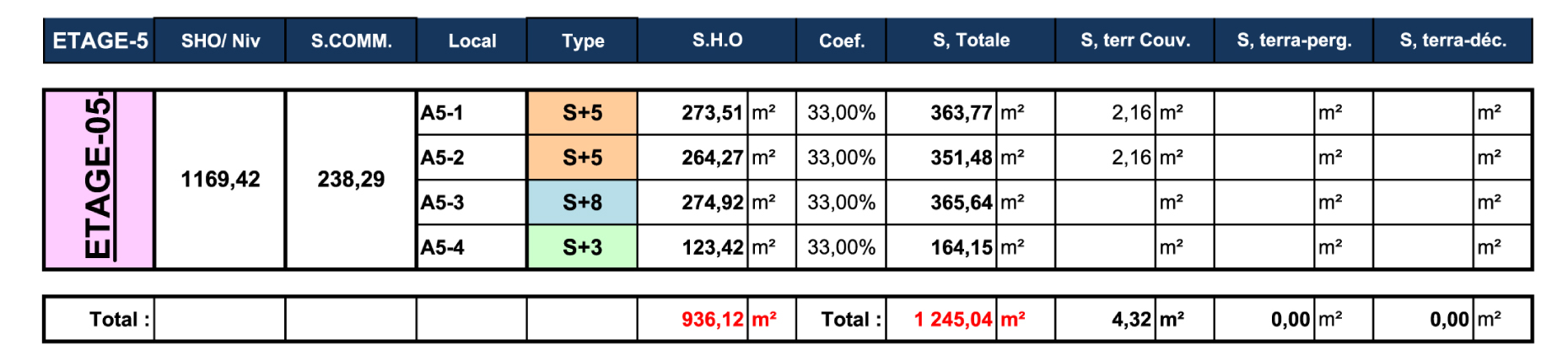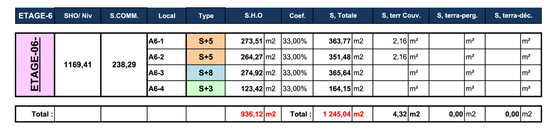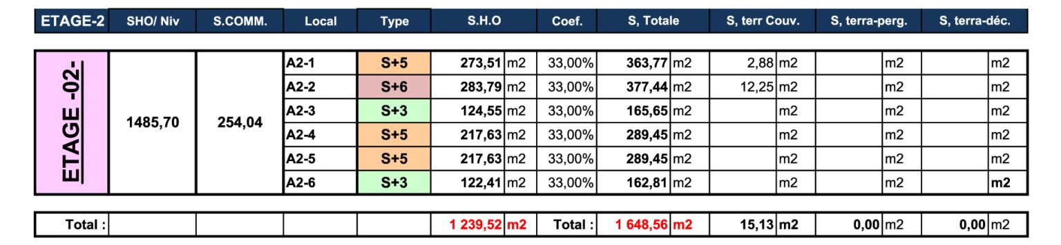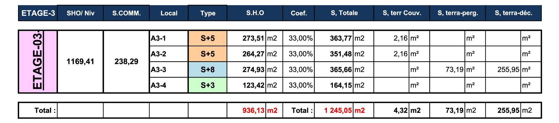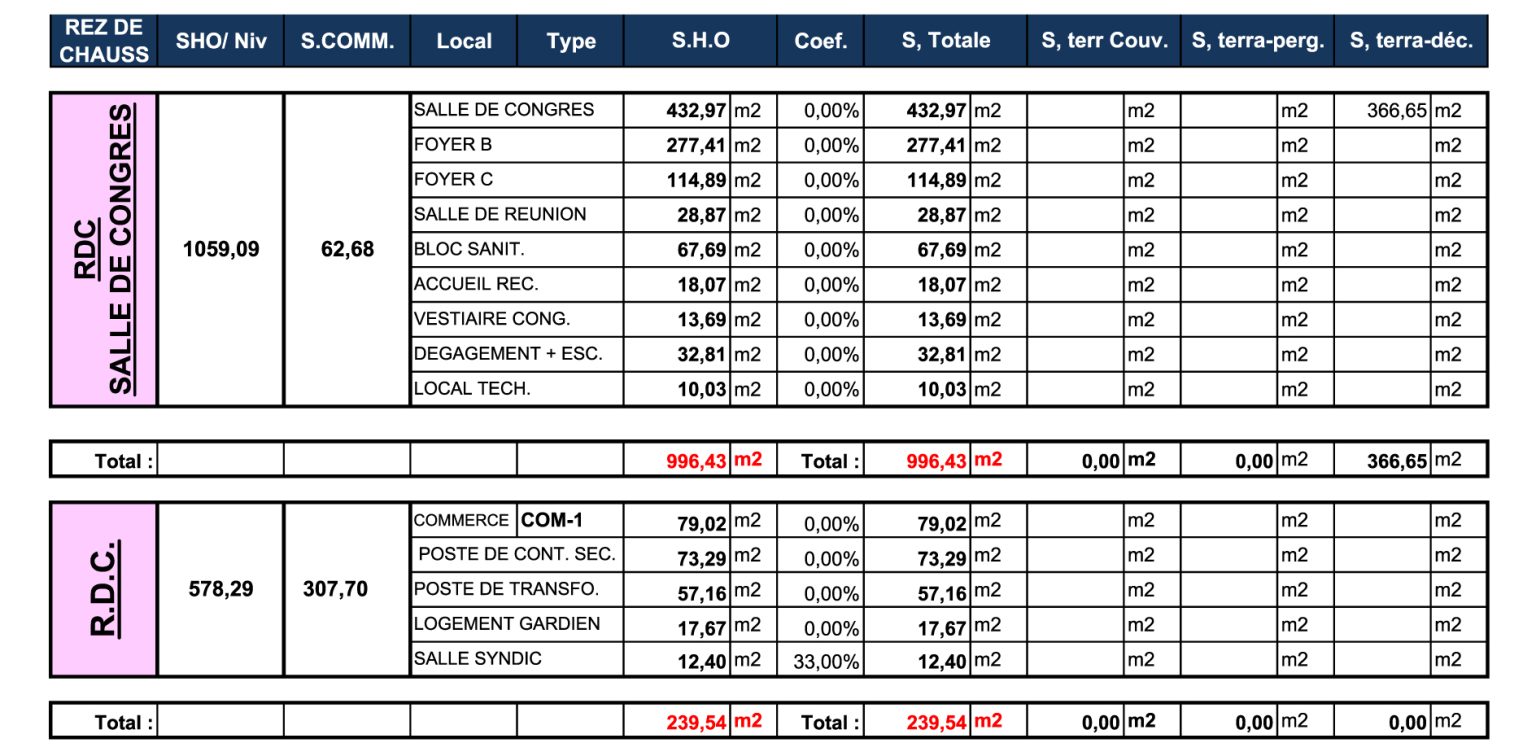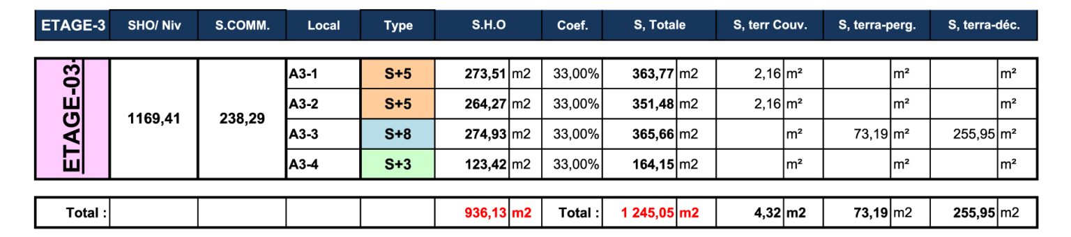TABLEAU DES SURFACES