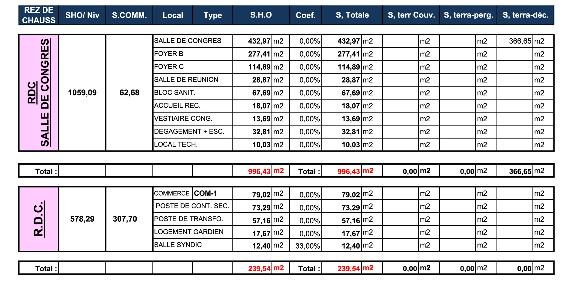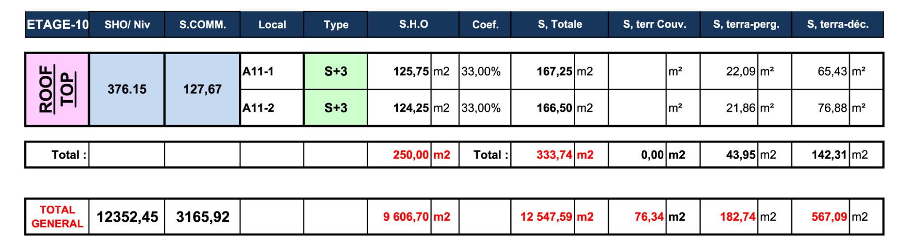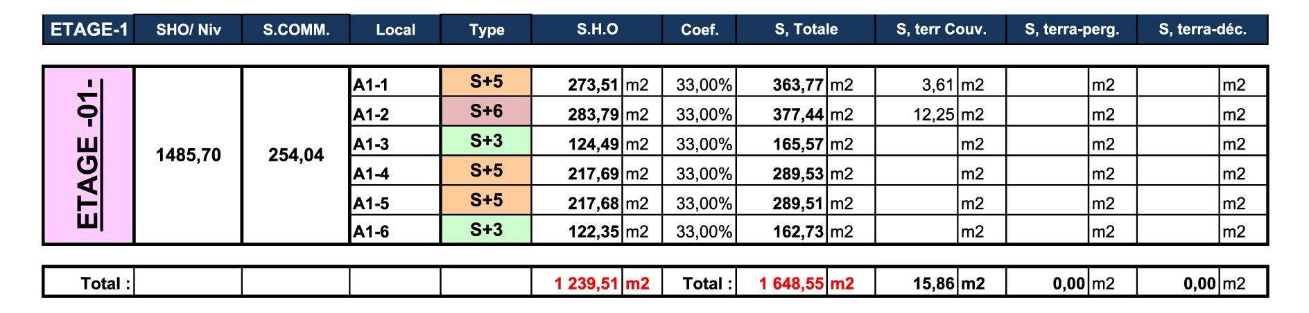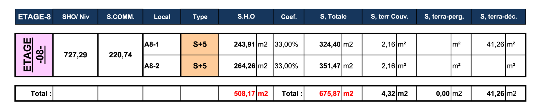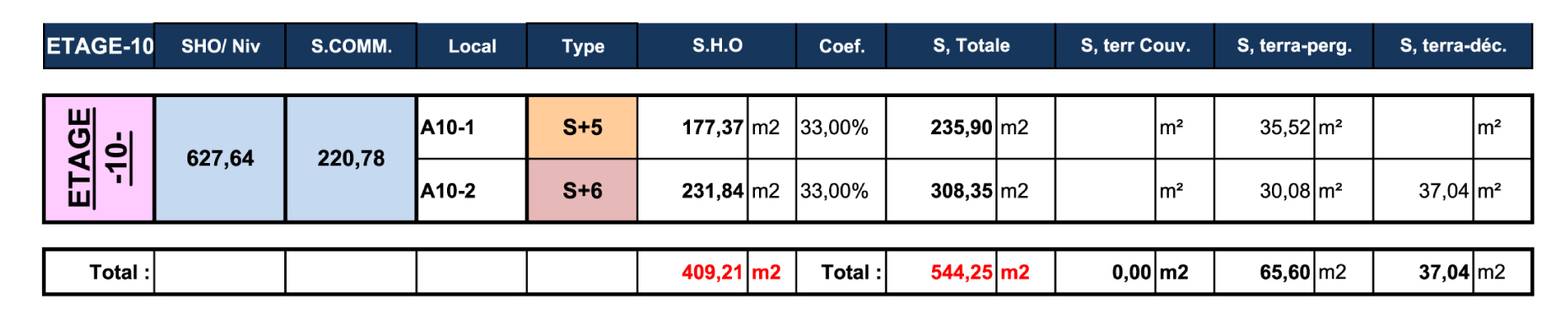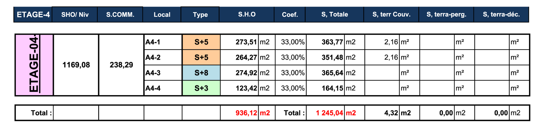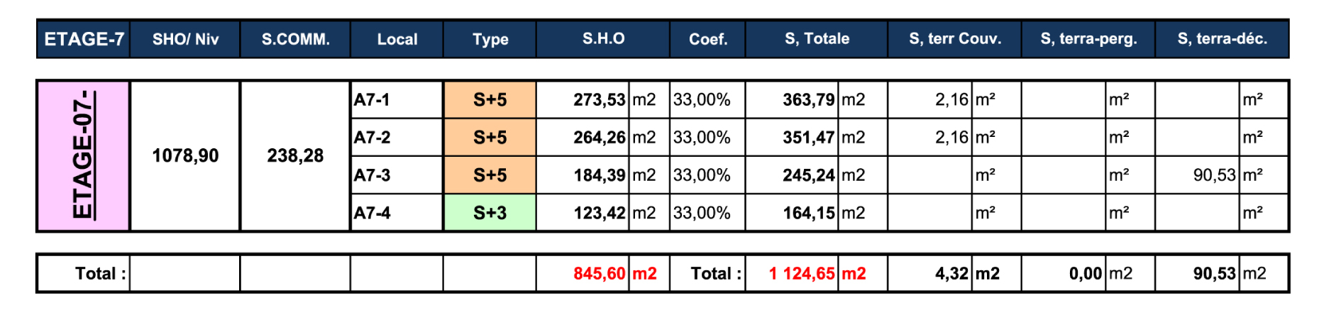 TABLEAU DES SURFACES