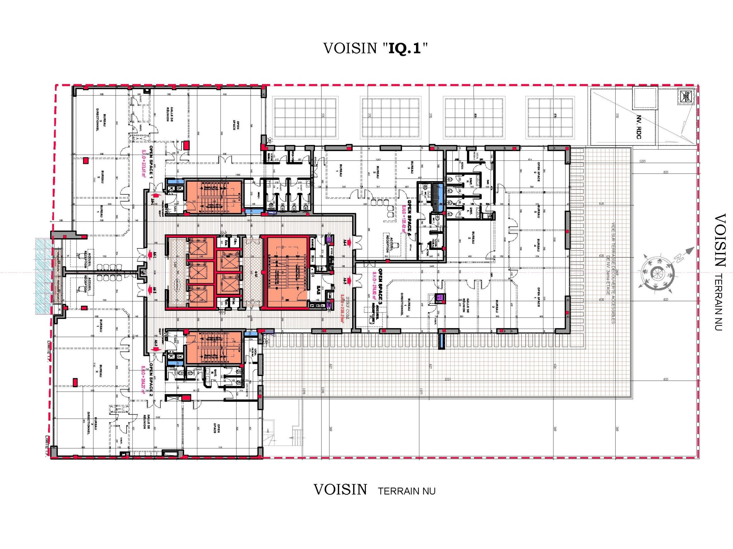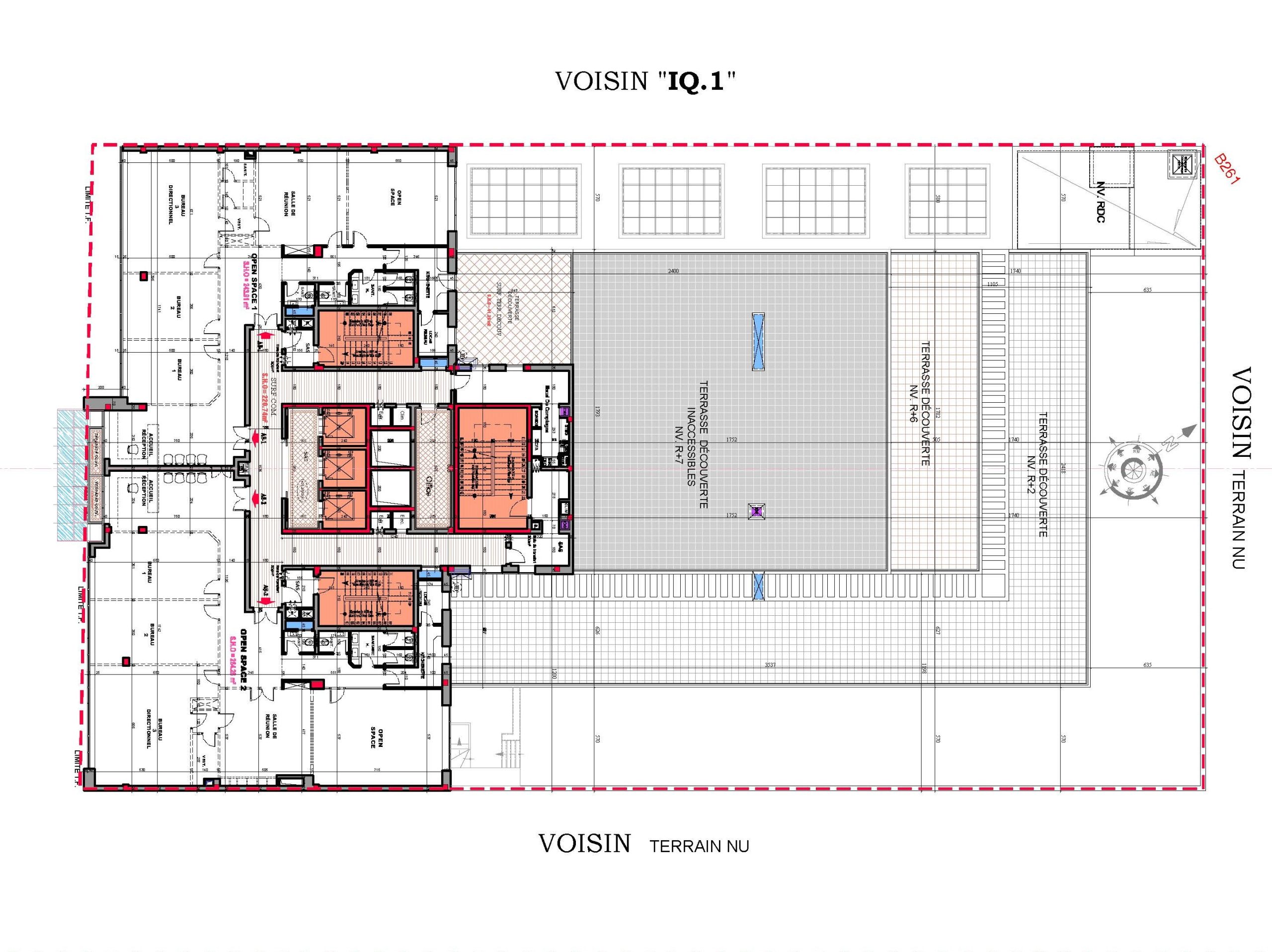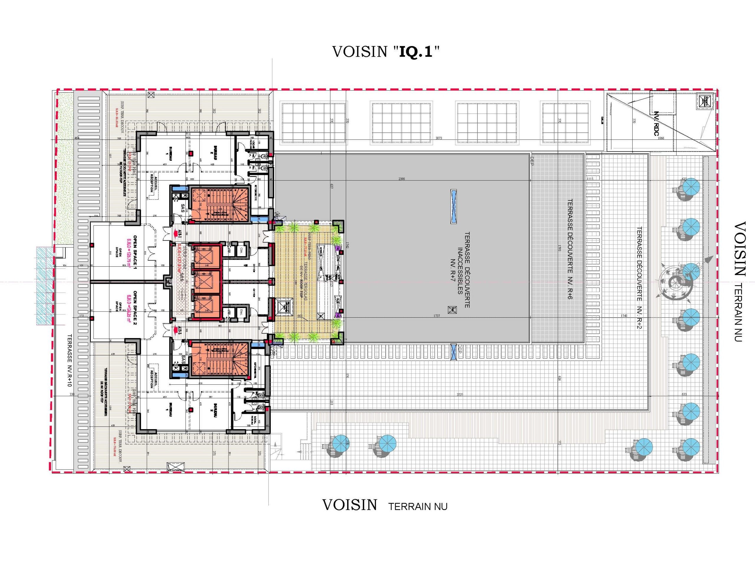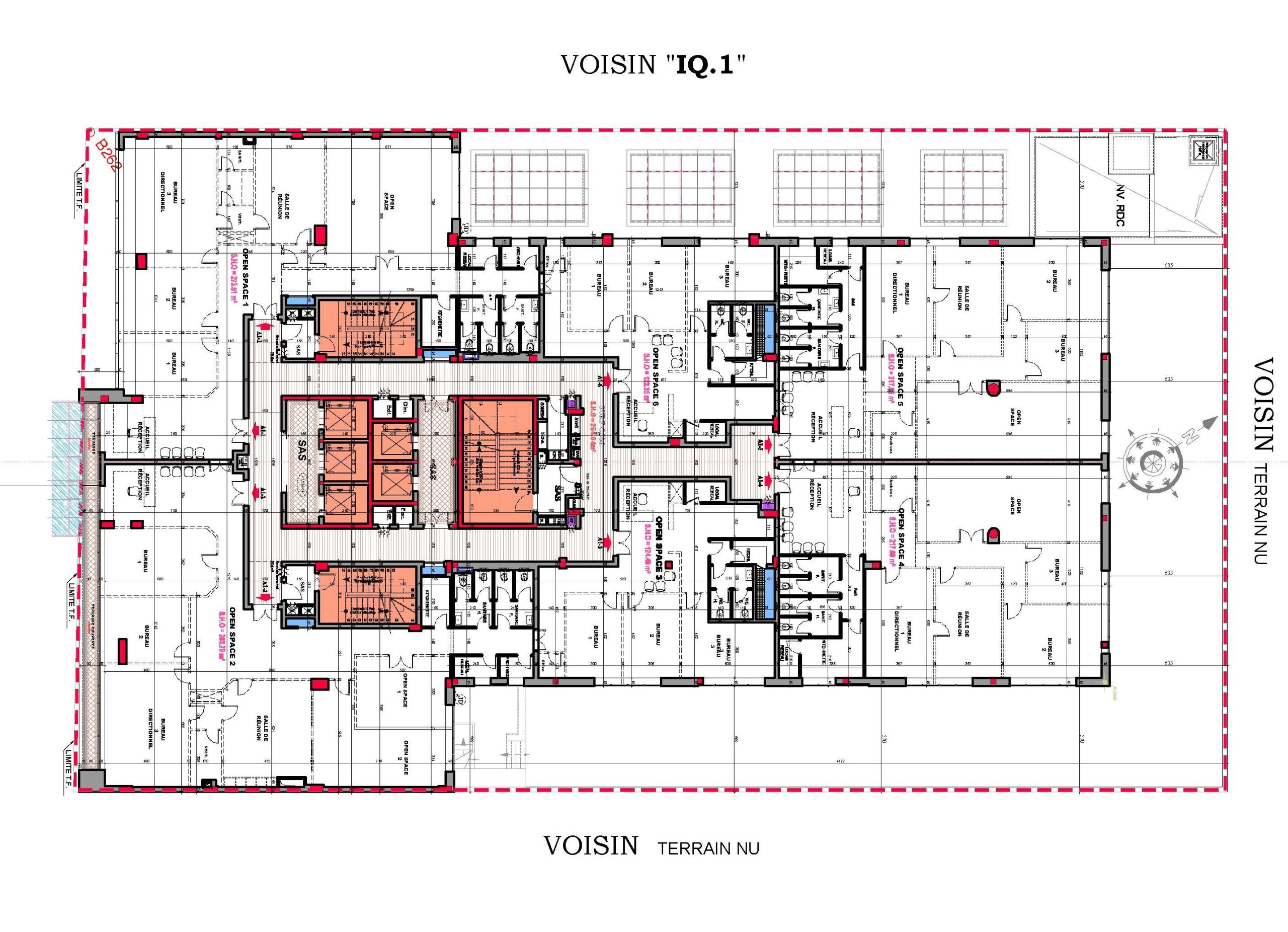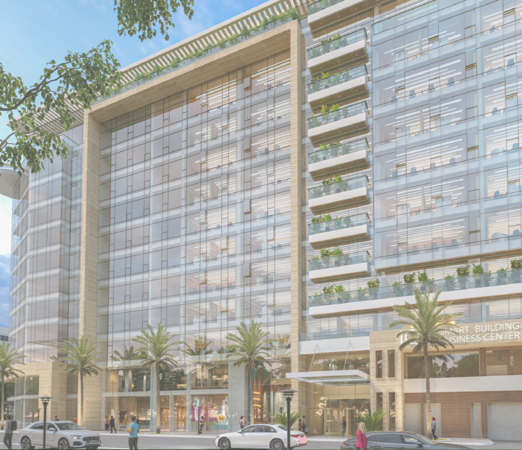 Le projet se compose de deux sous-sols offrant 110 places de parking, d’un rez-de-chaussée accueillant un hall de réception, un espace commercial, une salle polyvalente d’environ 1000 m², ainsi que plusieurs locaux techniques et services.La mezzanine comprend :-cinq salles de réunion-deux open spaces-un espace commercial.Les étages abritent au total 40 open spaces de différentes superficies, certains bénéficiant de vastes terrasses découvertes.Le dernier niveau intègre également une terrasse fumeur aménagée.L’immeuble est équipé de :-Cinq ascenseurs-Trois cages d’escaliersElle répond à toutes les normes de sécurité propres aux Immeubles de Grande Hauteur (IGH).