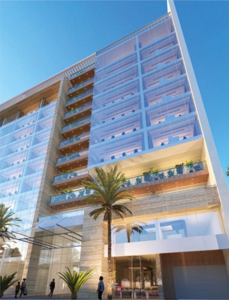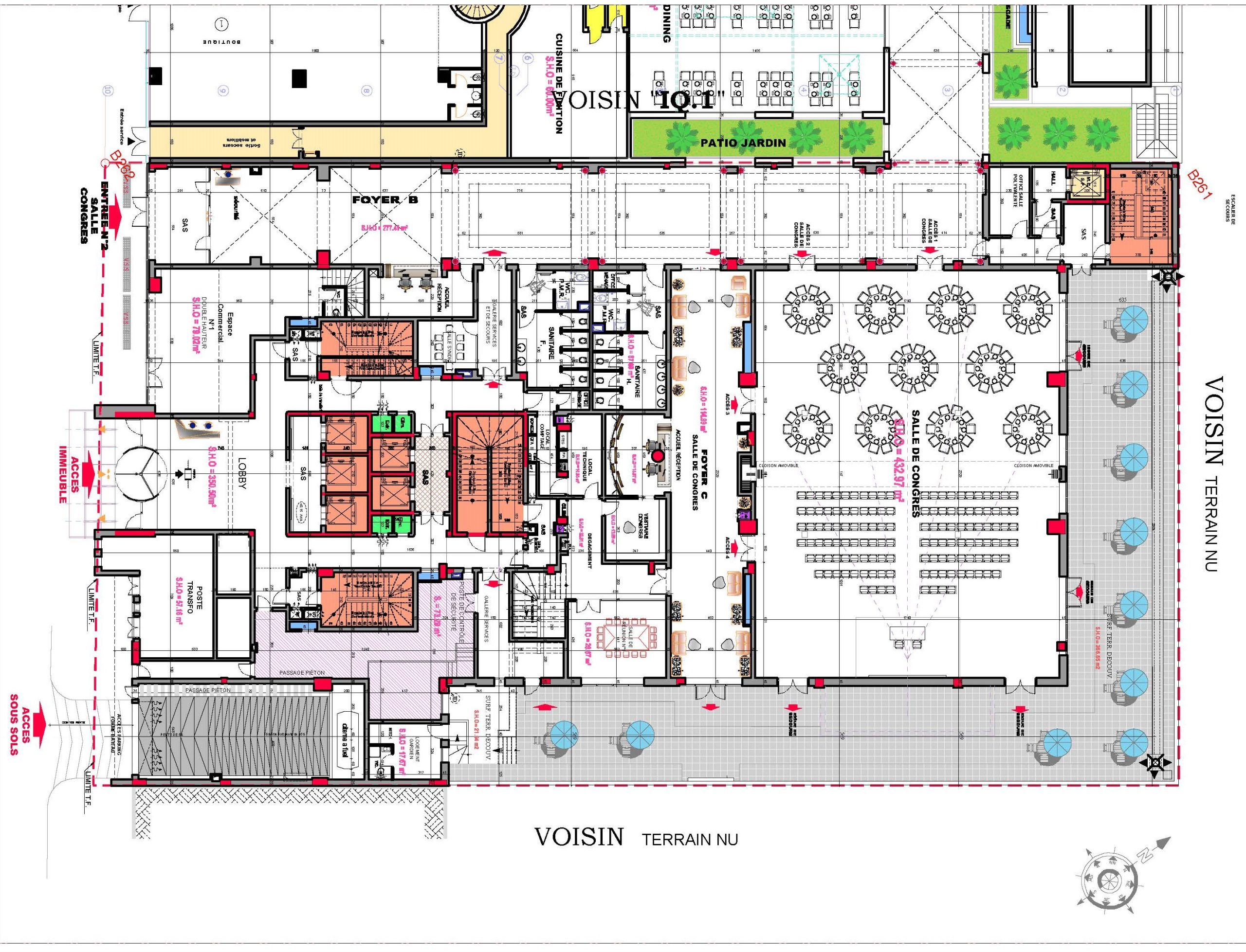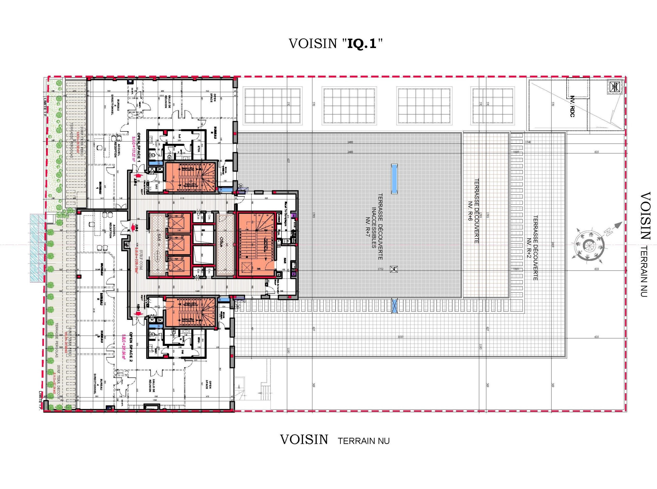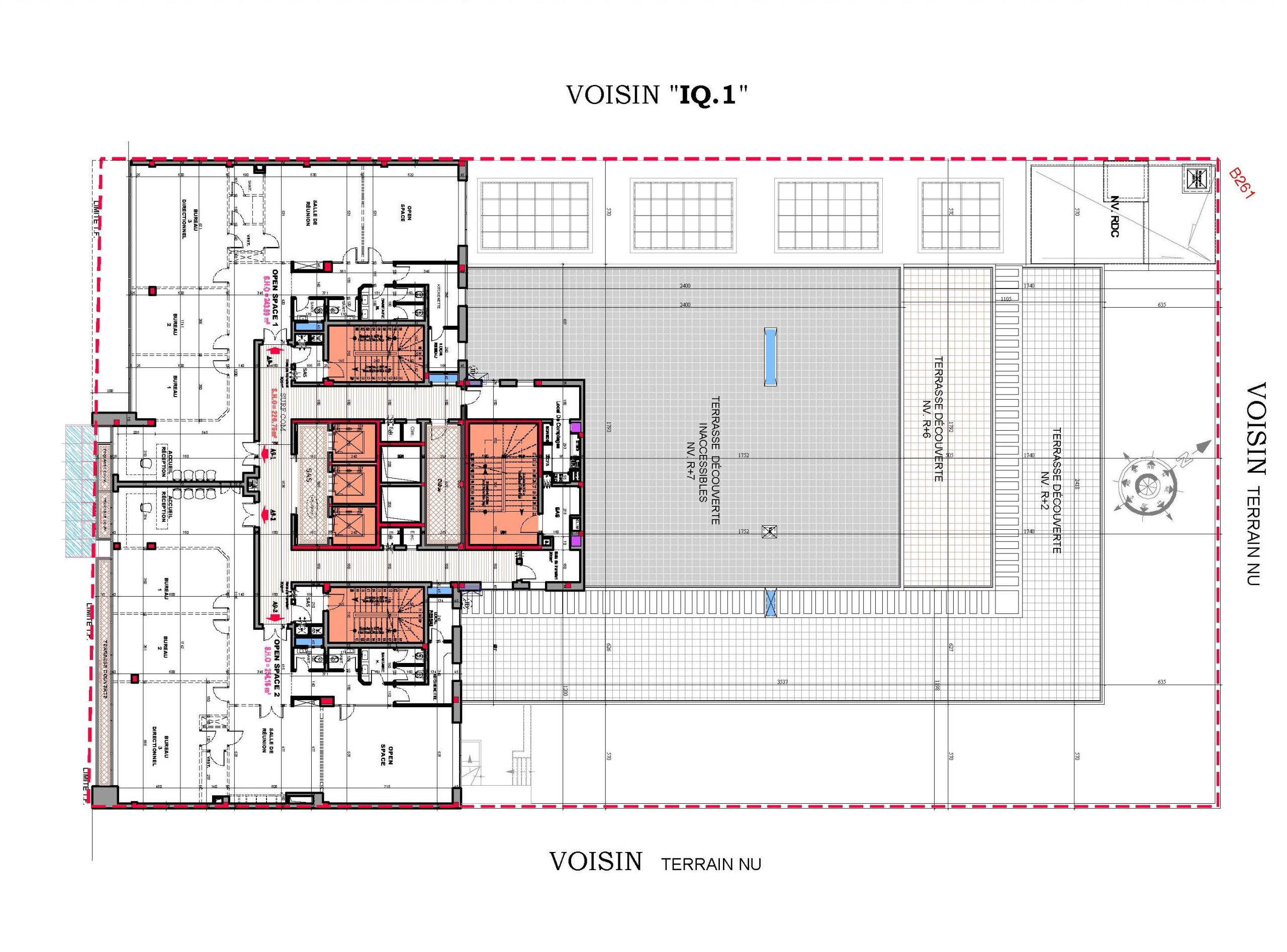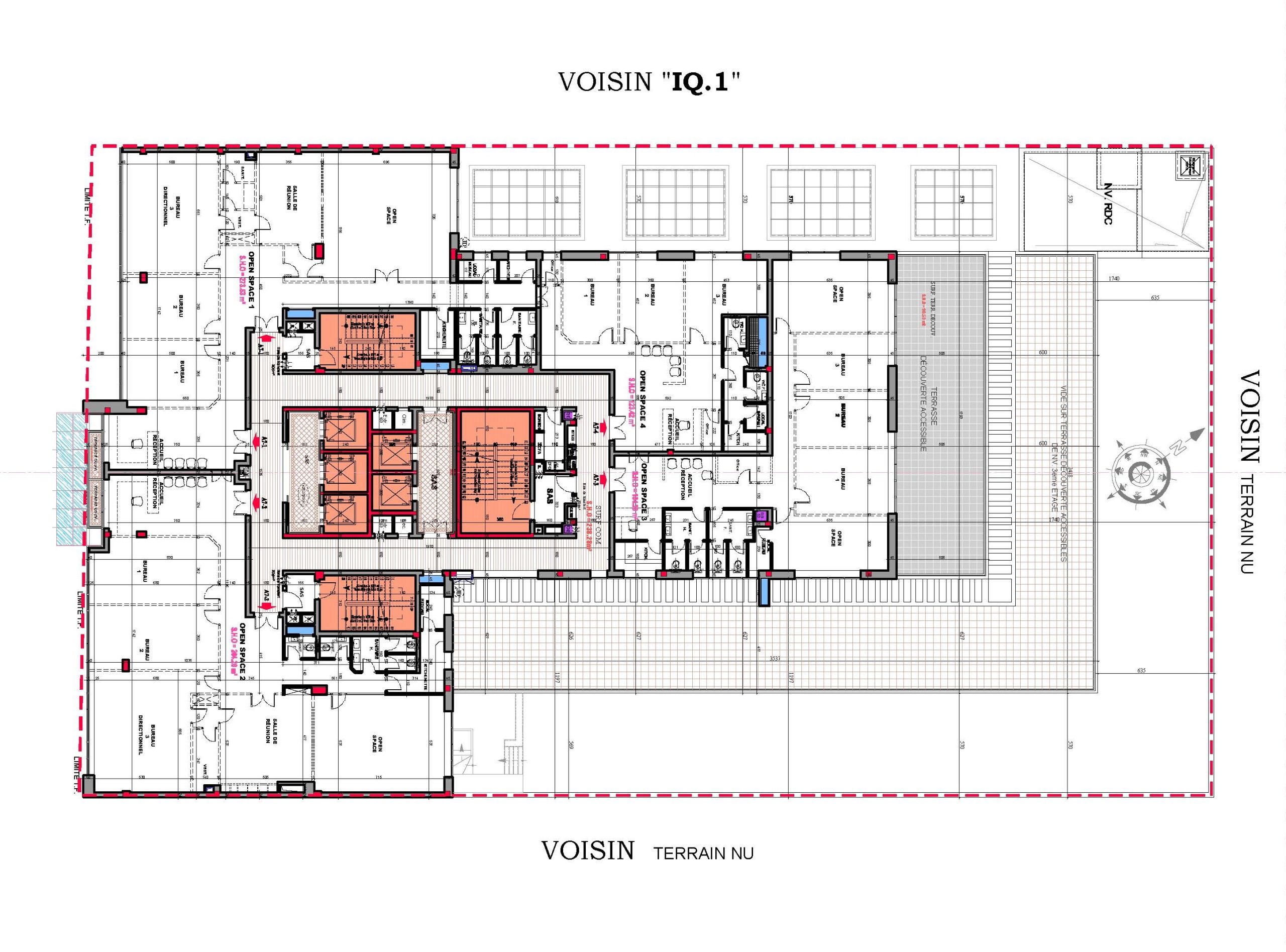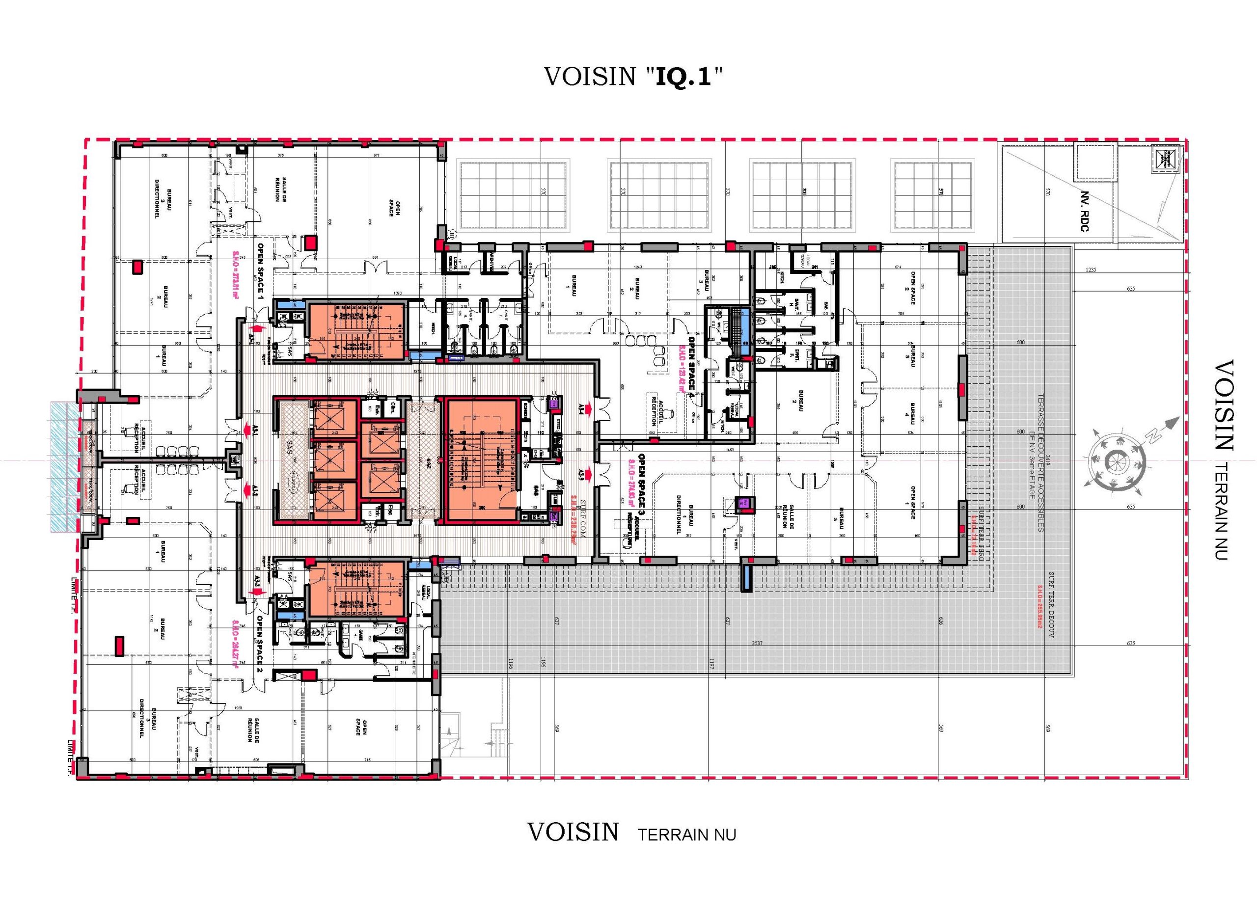 Le projet se compose de deux sous-sols offrant 110 places de parking, d’un rez-de-chaussée accueillant un hall de réception, un espace commercial, une salle polyvalente d’environ 1000 m², ainsi que plusieurs locaux techniques et services.La mezzanine comprend :-cinq salles de réunion-deux open spaces-un espace commercial.Les étages abritent au total 40 open spaces de différentes superficies, certains bénéficiant de vastes terrasses découvertes.Le dernier niveau intègre également une terrasse fumeur aménagée.L’immeuble est équipé de :-Cinq ascenseurs-Trois cages d’escaliersElle répond à toutes les normes de sécurité propres aux Immeubles de Grande Hauteur (IGH).